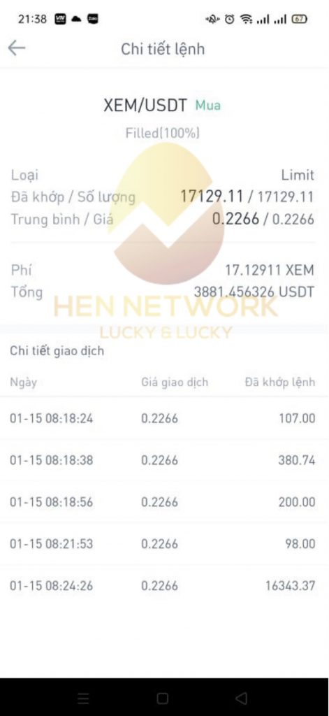 Giá mua 0.2266, tổng cộng 3,881 USDT