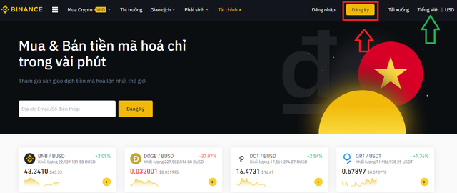 Tại trang chủ của Binance, click nút “Đăng ký” ở góc phải như hình dưới. Bạn nhớ chuyển ngôn ngữ giao diện Binance sang tiếng Việt để dễ thao tác nhé.