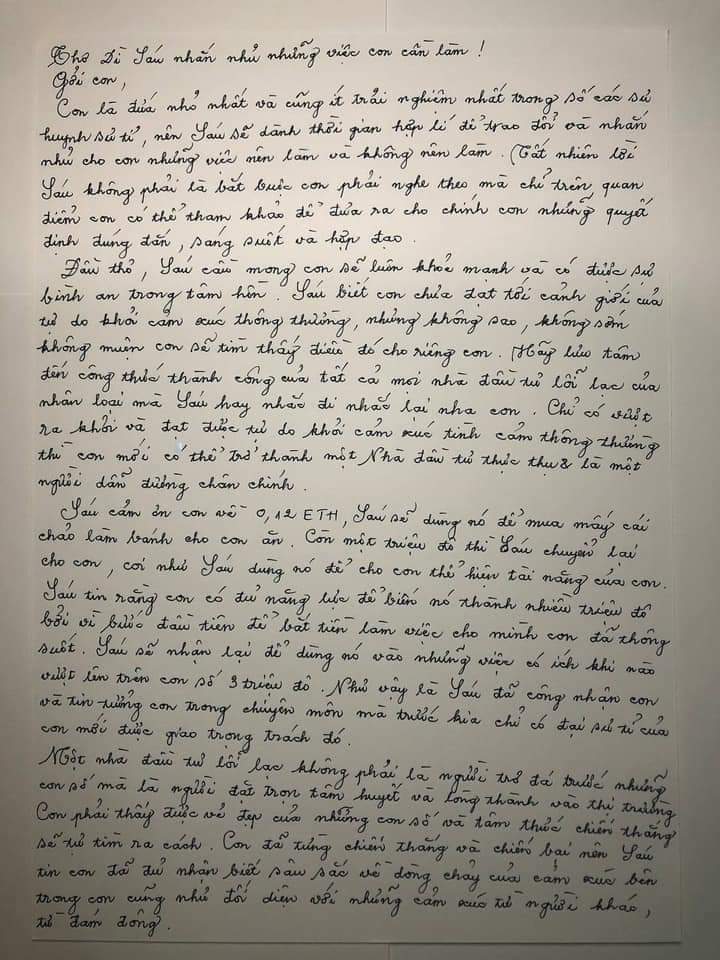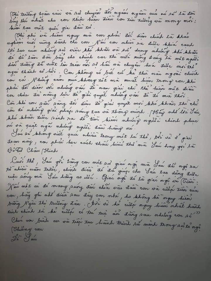 Đầu thơ, Sáu cầu mong con sẽ luôn khoẻ mạnh và có được sự bình an trong tâm hồn. Sáu biết con chưa đạt tới cảnh giới của tự do khỏi cảm xúc thông thường, nhưng không sao, không sớm không muộn con sẽ tìm thấy điều đó cho riêng con. Hãy lưu tâm đến công thức thành công của tất cả mọi nhà đầu tư lỗi lạc của nhân loại mà Sáu hay nhắc đi nhắc lại nha con. Chỉ có vượt ra khỏi và đạt được tự do khỏi cảm xúc tình cảm thông thường thì con mới có thể trở thành một Nhà đầu tư thực thụ & là một người dẫn đường chân chính.